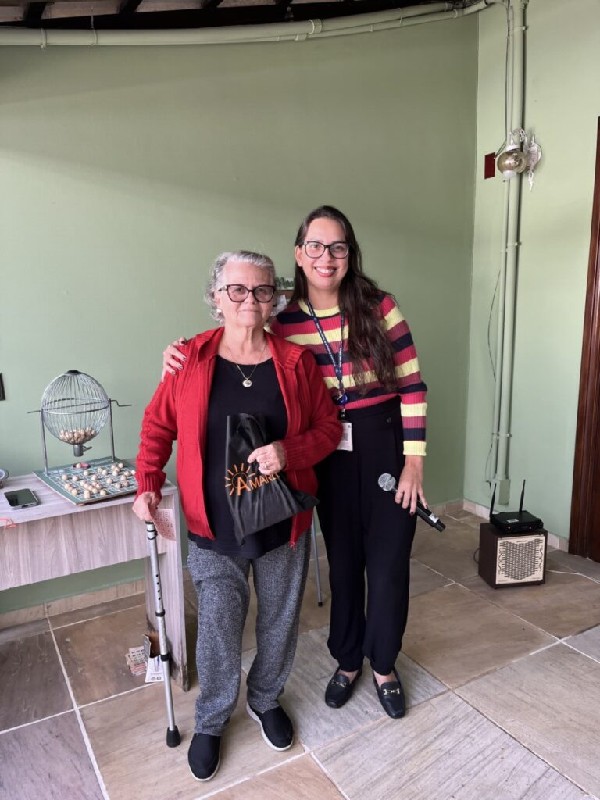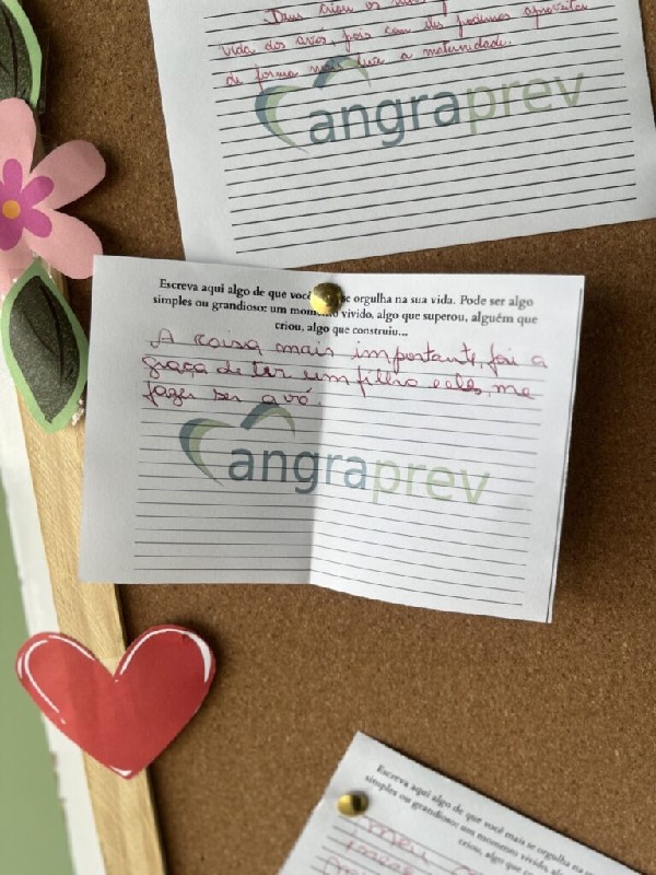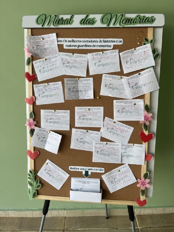 E para somar, tivemos a “Dinâmica do Mural das Memórias”, onde os aposentados puderam escrever em cartões histórias que lembravam seus avós ou momentos de suas próprias vidas dos quais se orgulham. Algumas dessas histórias foram compartilhadas em voz alta, criando um ambiente de riso e reconhecimento entre todos os presentes.
