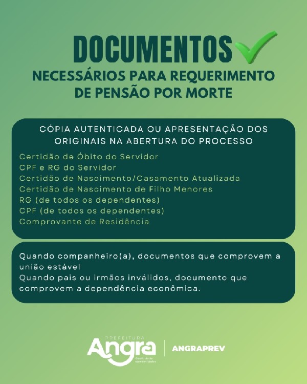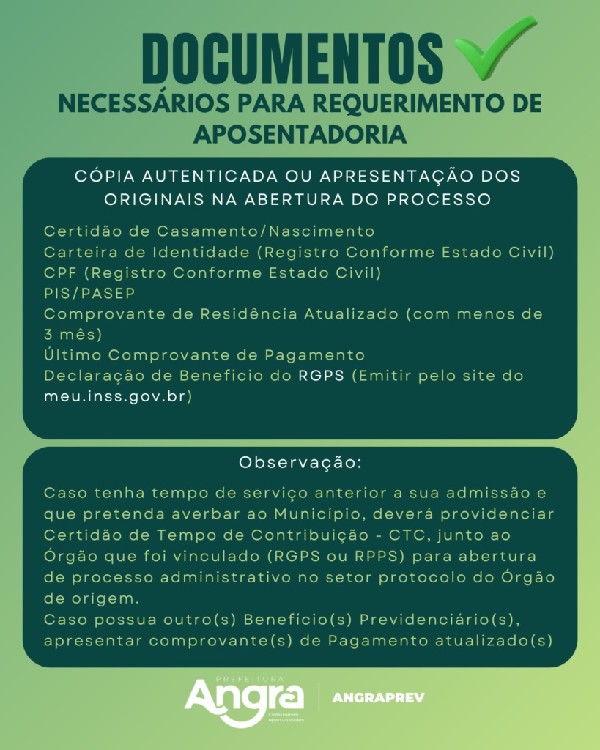 A Prefeitura de Angra dos Reis, atendendo às exigências do Tribunal de Contas do Estado do Rio de Janeiro (TCE-RJ), atualizou as orientações para os servidores e seus dependentes que desejam solicitar aposentadoria ou pensão por morte. O atendimento é realizado presencialmente em nosso Instituto, localizado na Rua Dr. Orlando Gonçalves, 231, no Parque das Palmeiras.